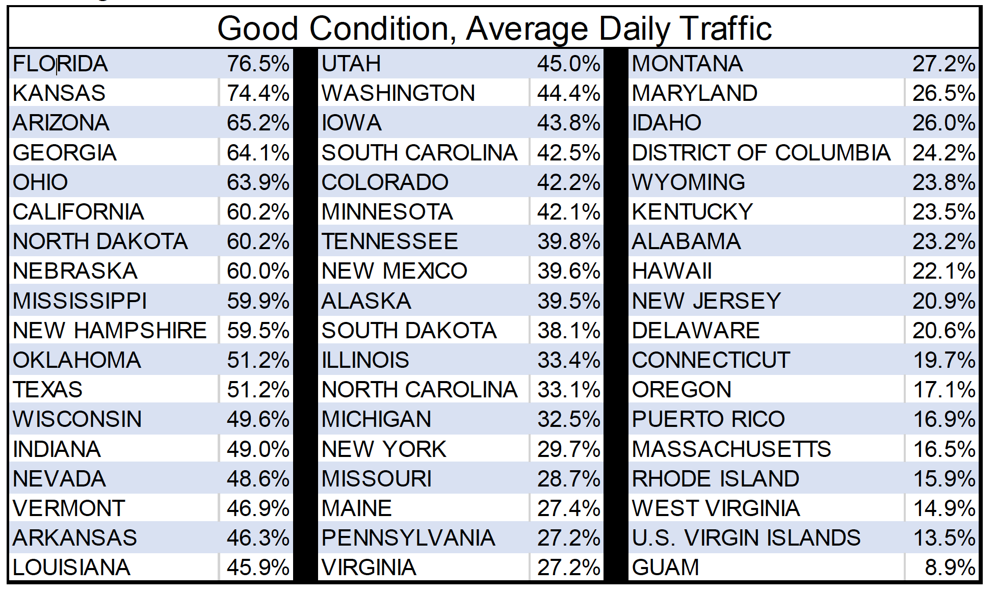 Merely looking at a count of bridges is not the best way to get a feel or the amount of bridge repairs required in each state. Average daily traffic (ADT), or the number of vehicles crossing bridges, is a better way to judge it. The table below ranks all 50 states and Washington, DC, Guam, Puerto Rico, and the U.S. Virgin Islands by average daily traffic (ADT), or the number of vehicles crossing bridges, in each state.